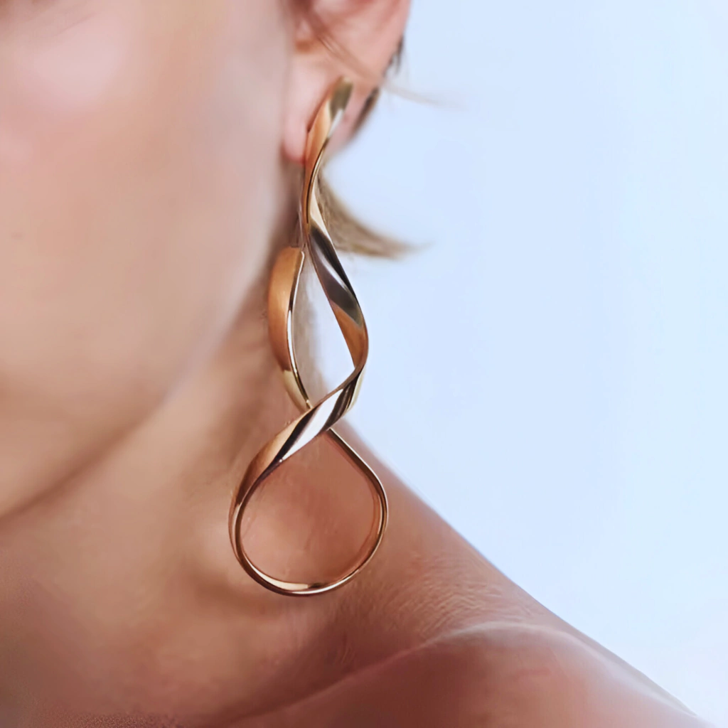 Aros colgantes en forma irregular, cierre con tuerca. De acero inoxidable.