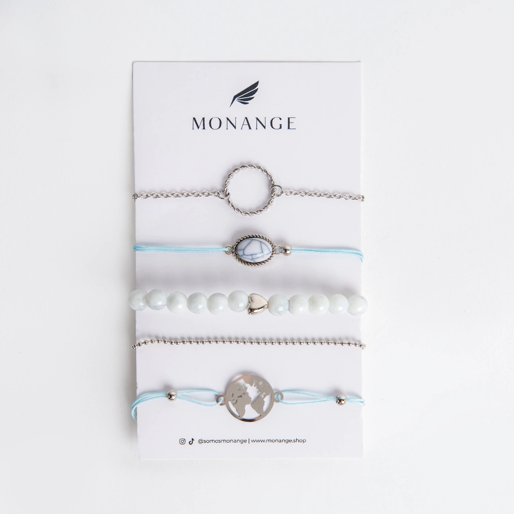 Set de 5 pulseras ajustables con dijes de corazon. mapa del mundo. circulo hueco. cuencas blancas. cadena.